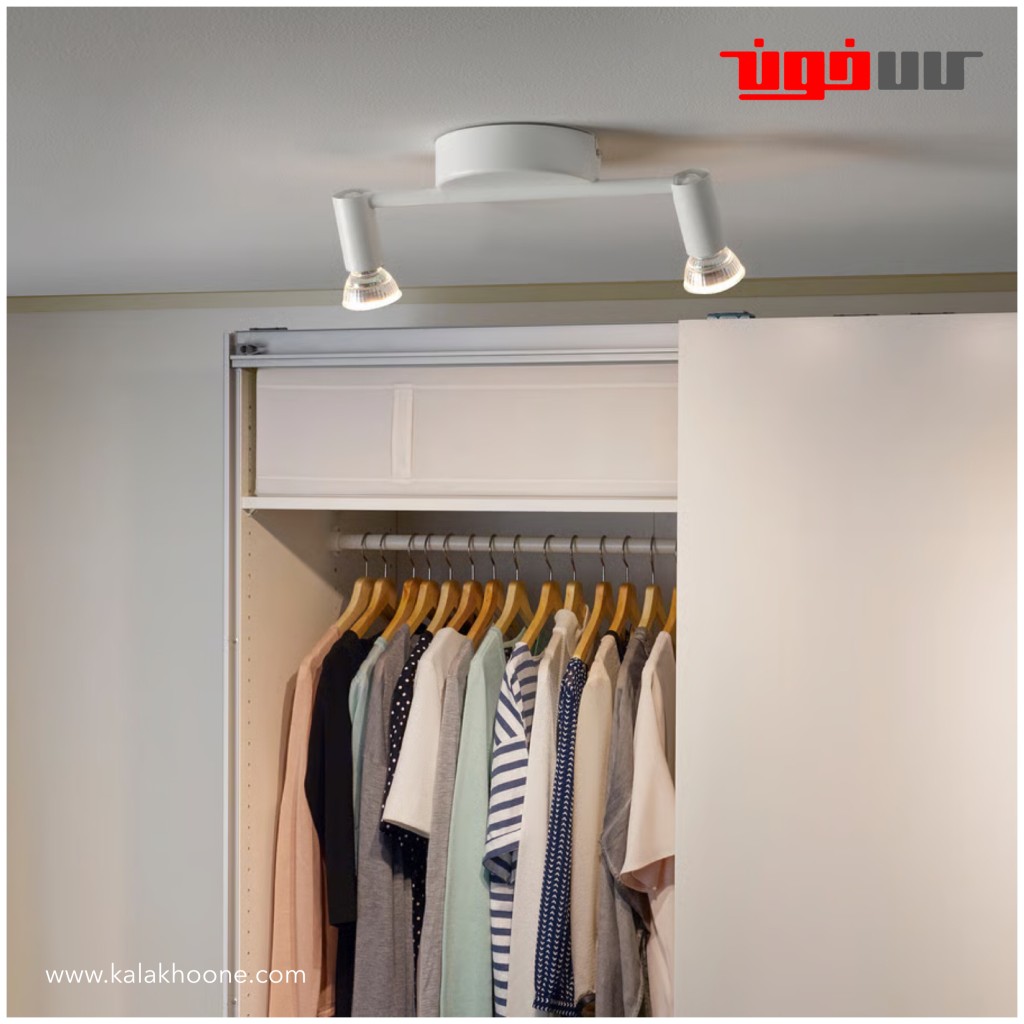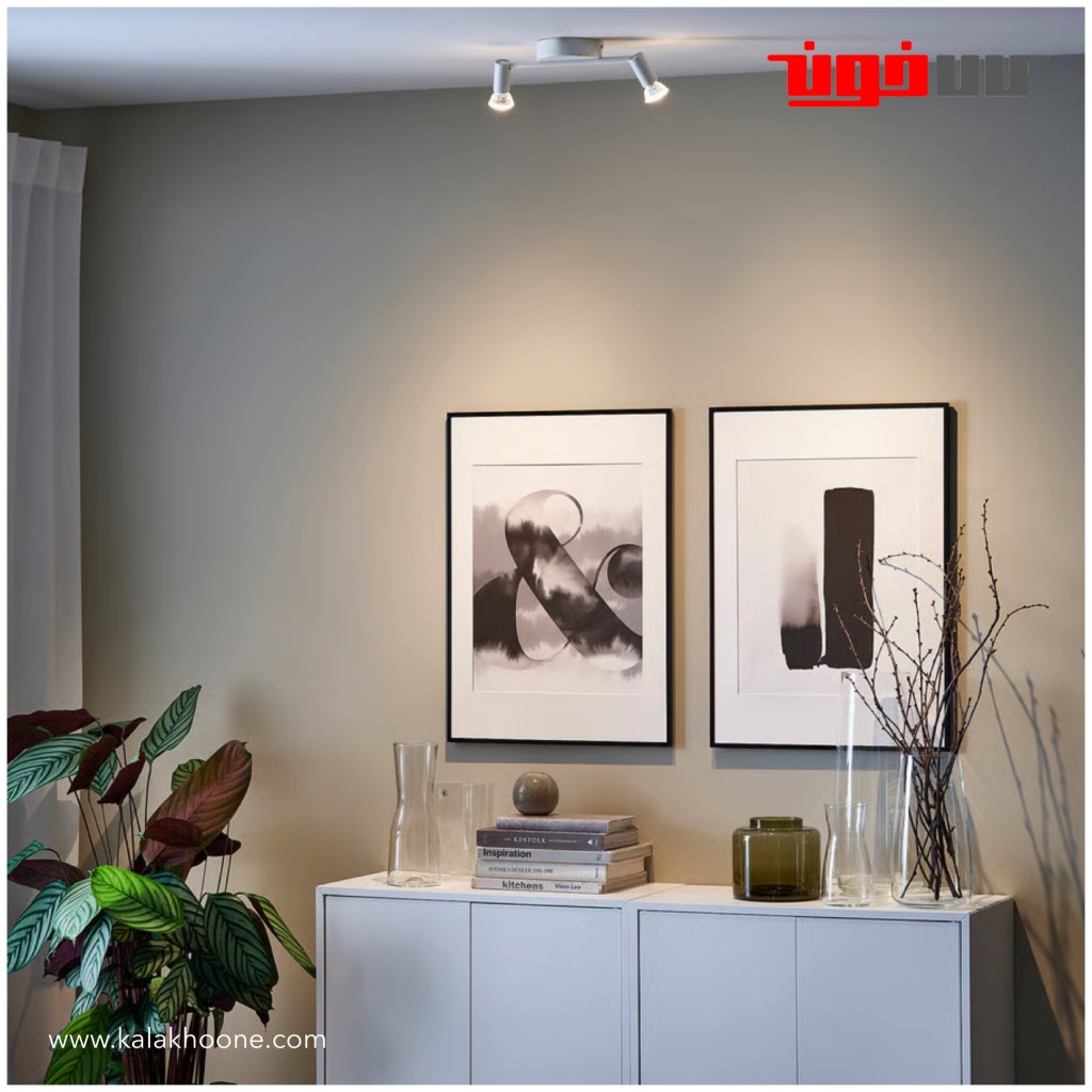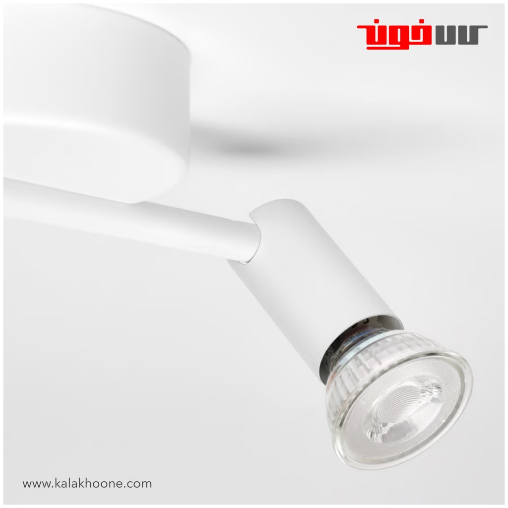 چراغ سقفی است که دارای دو نقطه قابل تنظیم در رنگ سفید است. این چراغ نورپردازی ایکیا به گونه ای طراحی شده است که بر روی سقف نصب می شود و نور متمرکزی را به مناطق یا اشیاء خاص در یک اتاق ارائه می دهد.