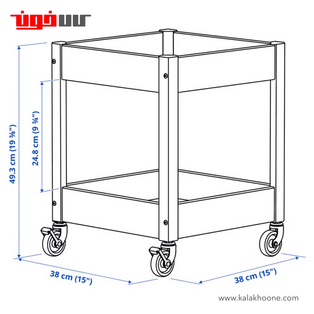 این ترولی دارای ابعاد طول 38 سانتیمتر، عرض 38 سانتیمتر و ارتفاع 49 سانتیمتر است