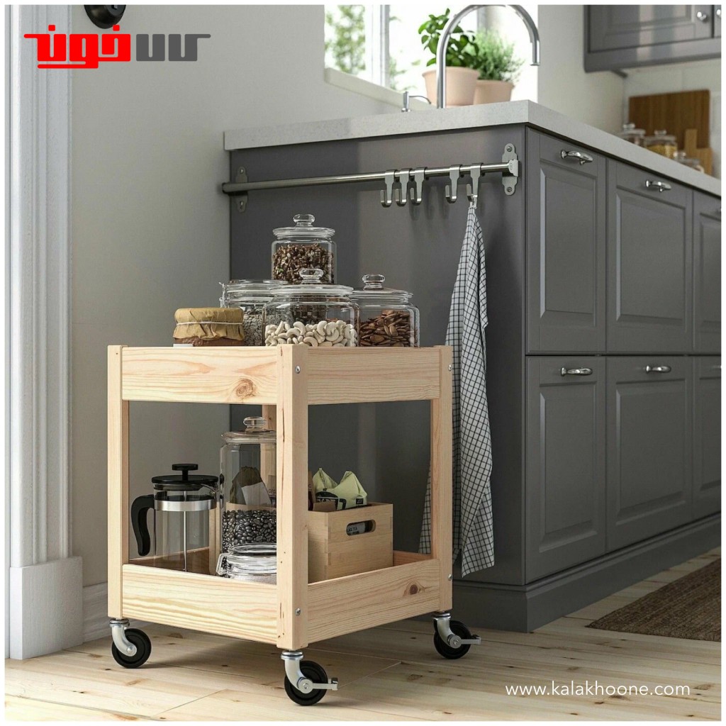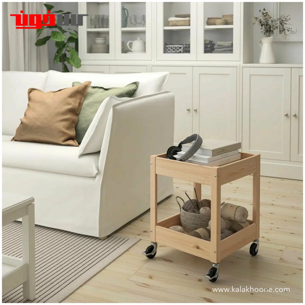 ترولی LOSHULT از چوب طبیعی صنوبر (Solid Pine) ساخته شده است که دوام و استحکام بالایی دارد. بخشهای کناری و پایهها از چوب طبیعی با چسب مقاوم و پوشش لاک اکریلیک شفاف ساخته شدهاند تا در برابر رطوبت و لکه مقاوم باشند.